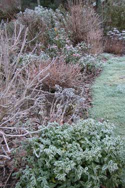 The frosting on the seed heads and bare branches is wonderful. The hebe struggles through the winter with its lovely pink flowers adding a bit of colour at that end of the garden. |