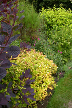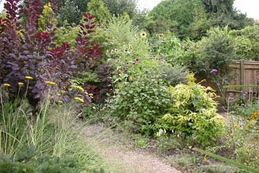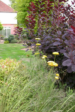 A quick peep through the cotinus and you get a good idea of the various colours. The yarrow you can see hasn't performed as well as normal this year - the few flowers there are are very good but there aren't many. The other yarrow has done much better - possibly time to move this one and give it more space? |