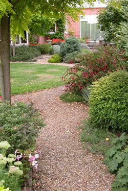 Just before we walk along the right hand path, a quick glance backwards to enjoy the spiraea bushes. The golden one is wonderful from early spring right through to Autumn with a great range of colours. |