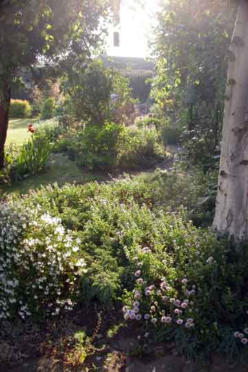 The silver birch is the main feature in what we call the woodland garden - it's lovely in all seasons but it does tend to shed leaves, twigs and anything else it can think of - possibly because of the number of birds and squirrels etc that use it. |