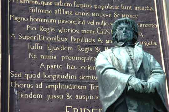 This square is just down from the cathedral which was one of the few places we ventured inside. Oleus Petri, the Swedish reformer, spread his Lutheran message from here (the statue is of him). The tablet tells the history of the cathedral (Storkyrkan). Originally a small village church was on the site in the 13th century. It was replaced in 1306 by a much bigger basilica, St Nicholas. The Gothic character of the interior was revealed in 1908 during restoration work. |