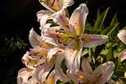 The Lilies (Lilium) are pretty majestic but plagued in the last couple of years by Scarlet Lily Beetle that just munches its way through the leaves and flowers, destroying everything in its wake. We still managed to get a few flowers this year (2005) but have to be vigilant and remove the beetles whenever we see them. |