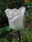 On the "D to F" page, I mentioned that Daffodils were my favourite flowers. Tulips run a close second. The fact that they are both in flower at the same time will give you an idea of my favourite time in the garden. The reasons I love tulips so much are the wide range of colours, the almost translucent feel to their petals, the way they stand tall (I could go on and on!). The specimen on the right is a Shirley tulip - they start white then gradually become more pink as they grow older (all in one season). They look great with Queen of the Night or other dark/black varieties. |