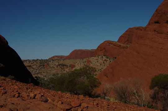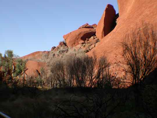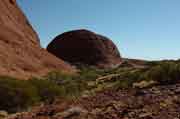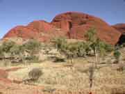 Our exercise for the day was in the form of a 5km+ hike through the Valley of the Winds to the Karingana Lookout at Kata Tjuta. Pretty hard going, more because of the heat than anything else but we both got there and back in one piece and felt quite pleased with ourselves. Kata Tjuta means "Many Heads" reflecting the 36 steep sided domes making up Kata Tjuta. This area is important and sacred under Anangu men's law and whilst visitors are welcome you are asked to keep to the paths etc (as you would expect). |