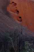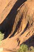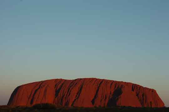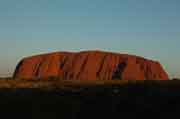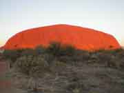 The geological reason for the red colour of Uluru is that the sandstone has "leaked" iron deposits and these have hardened to form a crust on the sandstone. This means that the sandstone won't erode as quickly as you might expect and the iron oxide provides the colour. |