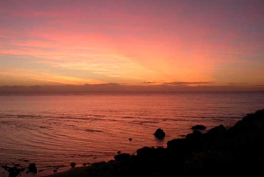 2 days of heavy driving were needed to get us from Port Douglas to Hervey Bay where we were due on Wednesday. We did most of the driving (c.1,100 kms, c.14.5 hours) on Day 1 so a very long and tiring day. A man in one of the service stations we stopped at told Jonathon he had the wrong accent for a long haul - apparently only Aussies do them! Having done a long haul and had Pie for dinner en route, we feel like true Aussies. We got up at 5 a.m. to set off but were rewarded with a stunning sunrise over the sea on the way. |
